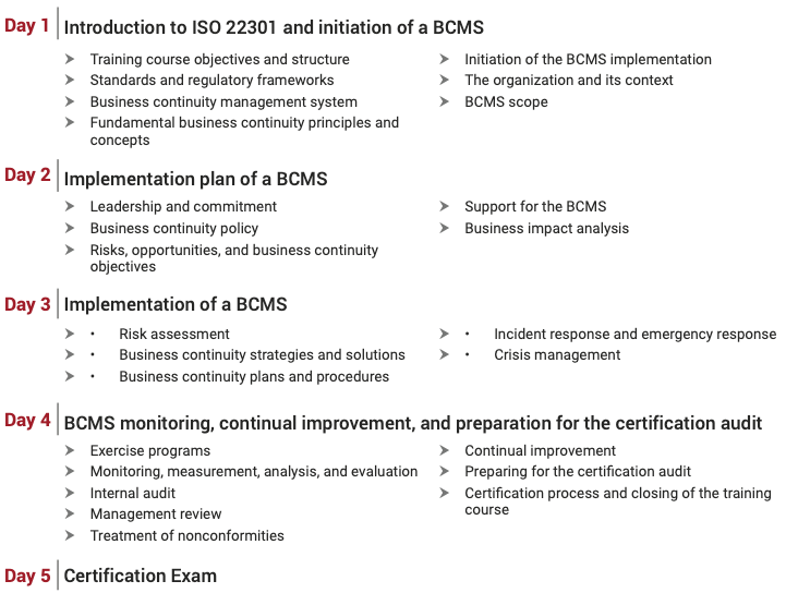 Organizations can make progress towards understanding and managing disasters, incidents, and risks by having a BCMS based on ISO 22301 in place. Therefore, PECB has designed this training course to prepare its participants implement a business continuity management system (BCMS) in compliance with the requirements of ISO 22301.