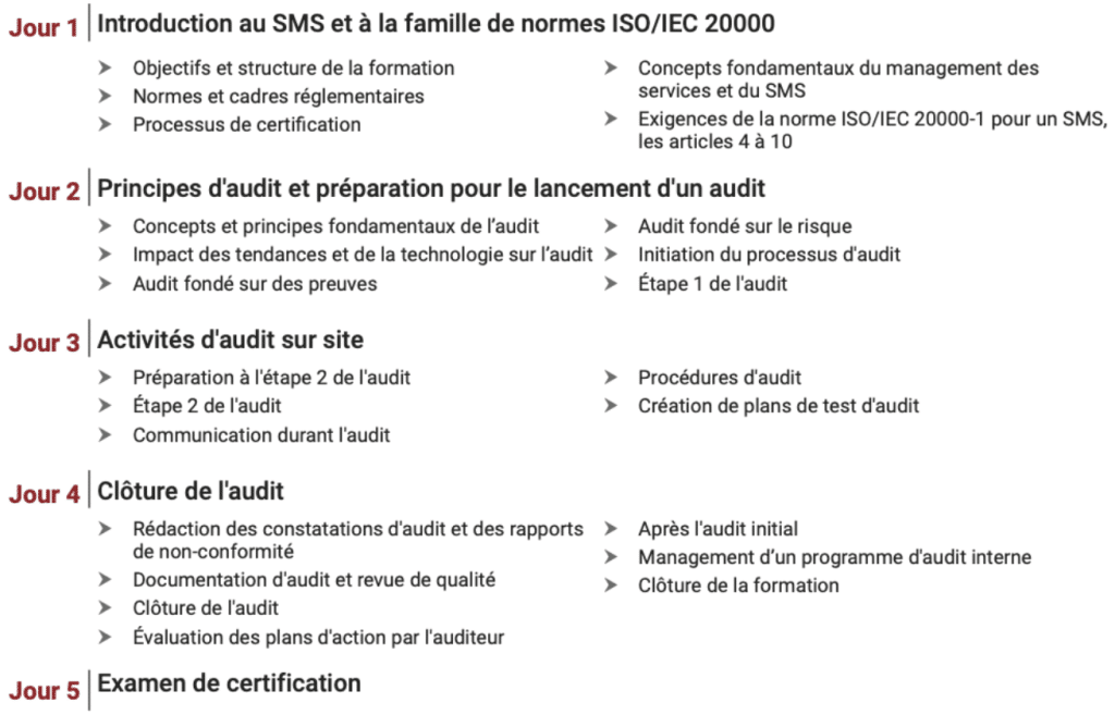 Pour plus d’information à cet égard, veuillez consulter le Fifalde-ISO-20000-1-LA-FR-Course-Description-FR-V1.1.PDF